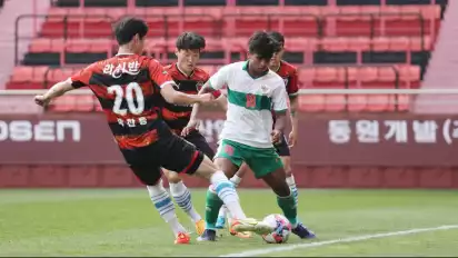Sebelum kalah oleh tim junior Pohang Steelers, Timnas U-23 mampu mengalahkan Andong Science College dengan skor 4-2 di Haemaji Football Field, Korea Selatan pada Kamis (21/04). Muhammad Ridwan yang berasal dari Persik Kediri mengemas satu gol saat tim U-23 Indonesia.