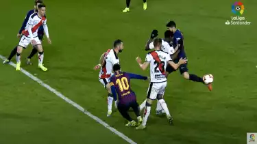 Jordi Amat saat bermain untuk Rayo Vallecano berhadapan dengan Lionel Messi di Liga Spanyol.