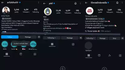 Tiga akun Instagram tersebut adalah akun milik Ketua Umum PSSI Erick Thohir, akun Instagram resmi PSSI dan akun Instagram resmi Timnas Indonesia.