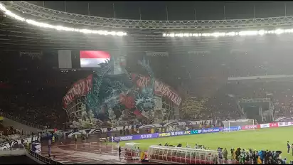 Berdasarkan pantauan tvOnenews.com di lokasi, Ultras Garuda yang berada di tribun selatan menampilkan koreo terkait pencapaian Timnas Indonesia.