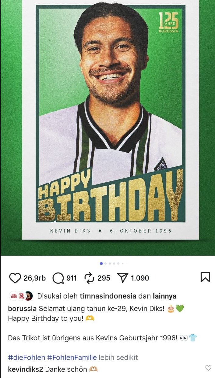 "Selamat ulang tahun ke-29, Kevin Diks! Selamat Ulang Tahun untukmu!,ā tulis Monchengladbach di Instagram resminya, @borussia.