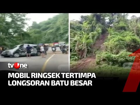 Sumedang, Jawa Barat - Dua mobil ringsek setelah tertimpa material bebatuan besar dari tebing setinggi 50 meter yang longsor di Jalan Raya Cadas Pangeran, Kabupaten Sumedang, Jawa Barat pada Sabtu petang. Akibat peristiwa tersebut, 4 orang mengalami luka-luka.Â