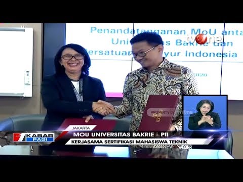 Memiliki banyak lulusan Sarjana Teknik, Universitas Bakrie (UB) bekerja sama dengan Persatuan Insinyur Indonesia (PII) sepakat mendorong Sarjana Teknik untuk legal berpraktik sekaligus memiliki kompetensi unggul. Follow akun media sosial tvOne lainnya: Twitter: Klik Disini Facebook: Klik Disini Instagram: Klik Disini Saksikan juga program-program unggulan tvOne lainnya: Kabar Pagi Kabar Siang Kabar Petang Kabar Hari Ini Kabar Dunia Kabar Baik Apa Kabar Indonesia Pagi Apa Kabar Indonesia Malam Indonesia lawyers club ILC Fakta tvOne Indonesia Business Forum Dua Sisi tvOne E-Talkshow tvOne #tvOnenews #tvOne