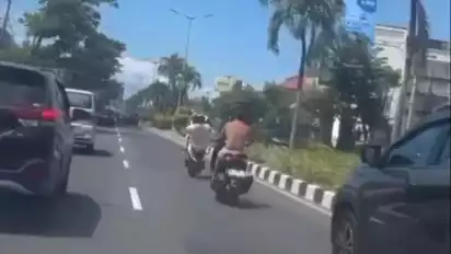WNA yang belum diketahui identitasnya tersebut, mengendarai motor tanpa menggunakan baju atau bertelanjang dada dan tanpa menggunakan helm, pada Kamis (27/4) siang.