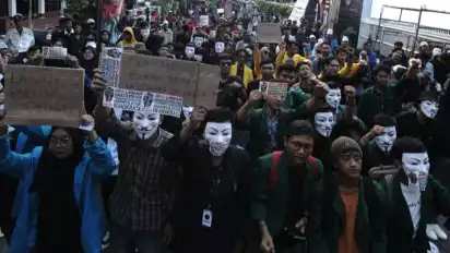 Selain itu para mahasiswa yang kompak menggunakan topeng topeng Guy Fawkes.