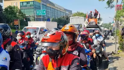 Dengan menggunakan kendaraan roda dua dan empat, ratusan buruh dari Federasi Serikat Pekerja Metal Indonesia (FSPMI) melakukan konvoi sampai Jakarta melalui jalur arteri.