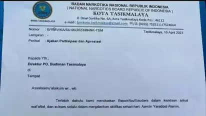 "Kami segenap keluarga besar Badan Narkotika Nasional Kota Tasikmalaya mohon partisipasi dan apresiasi bapak/ibu/ saudara untuk membantu berupa THR maupun paket lebaran untuk 28 anggota di lingkungan BNN Kota Tasikmalaya," bunyi kutipan bagian akhir dalam surat.