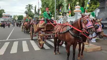 Purworejo, tvOnenews.com - Suasana di Jalan Raya purworejo Jawa Tengah, ramai dengan iring-iringan kereta kuda dan pasukan bregada dalam kirab budaya, pada Senin (27/2/2023).