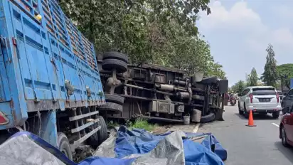 Truk Gandeng Terguling di Jalan Solo-Yogyakarta Wilayah Klaten, Diduga Sopir Mengantuk