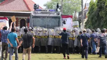 "Sehingga kendaraan perintis water cannon diterjunkan untuk membubarkan masa yang semakin bringas," lanjut Kapolres.