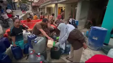 Warga Desa Maitan, Tambakromo, Pati, Jawa Tengah, antre bantuan air bersih, Selasa (3/10/2023).