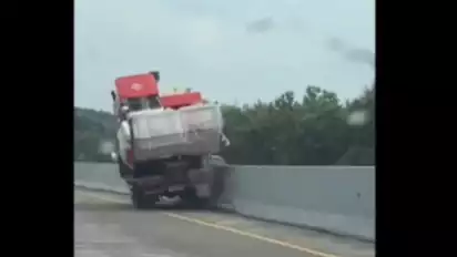 Dalam video yang beredar, tampak pengendara mobil merekam detik-detik truk pengangkut alat berat itu jalan sendiri di jalur turunan dan menambrak beton pembatas jalan dan oleng ke kiri, lalu meluncur ke arah kiri dan menabrak lagi pembatas jalan di sisi tepi. Truk lalu melaju lagi.