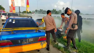 Kepolisian yang bertugas dengan cepat membantu, memadamkan api sehingga mobil tidak terbakar.