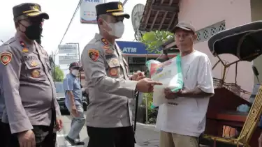 Sumaryono (57) salah seorang penerima bantuan menyambut baik bantuan sosial berupa beras yang dibagikan polisi.