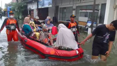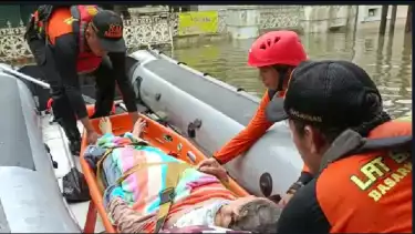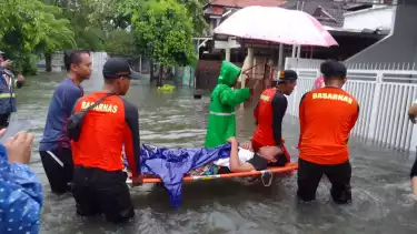 Tim SAR Semarang sedang Mengevakuasi Seorang Warga yang Sakit di saat Bencana Banjir Melanda Semarang. Â
