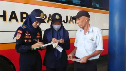 Petugas melakukan pemeriksaan mulai dari kelengkapan surat kendaraan, kondisi ban, lampu, rem dan perlengkapan lain di dalam bus.Â