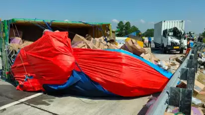 Madiun, tvOnenews.com - Kecelakaan lalu lintas yang melibatkan truk box paket nopol B 9302 FXX dengan truk ekspedisi terjadi di jalan tol Madiun, tepatnya di KM 615 A, di Desa Bajulan Kecamatan Saradan, Kabupaten Madiun, Senin (10/7/2023) sekitar pukul 08.30 WIB.