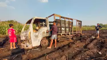 Magetan, tvOnenews.com - Diduga terjadi korsleting listrik, sebuah truk diesel nopol AE 8179 NH pengangkut tebu ludes terbakar di tengah-tengah lahan tebu seluas setengah hektar milik Karbani di Desa Banjarjo, Kecamatan Ngariboyo, Kabupaten Magetan, Rabu (30/8) siang.