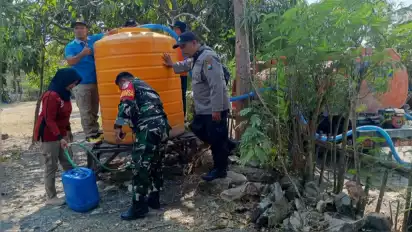 Nganjuk, tvOnenews.com - Menghadapi dampak kemarau panjang yang melanda berbagai wilayah di Nganjuk, polisi bersama pelajar dan BPBD Kabupaten Nganjuk, dikerahkan untuk melakukan droping air bersih guna membantu masyarakat yang terdampak kekeringan.