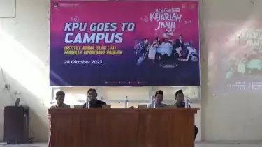 Nganjuk, tvOnenews.com - Komisi Pemilihan Umum (KPU)Â Nganjuk bersama mahasiswa menggelar nonton bareng film 'Kejarlah Janji' di Kampus Institut Agama Islam Pangeran Diponegoro, Minggu (29/10).