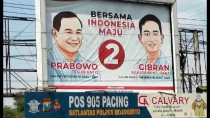 Terlihat baliho pasangan capres dan cawapres nomor urut 02, Prabowo Subianto-Gibran Rakabuming Raka nangkring di atas pos 905 Pacing, Sat Lantas Polres Mojokerto. Baliho yang luasnya sekitar 4 x 3 meter persegi ini disangga dengan tiang besi yang berdiri kokoh di samping kanan dan kiri pos polisi tersebut.