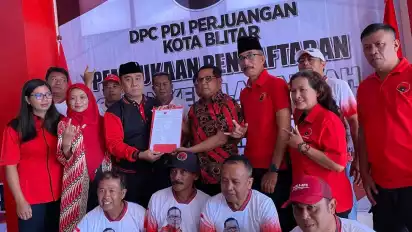 Blitar, tvOnenews.com - Yudi Meira Ketua Asosiasi Kota (Askot) Persatuan Sepak Bola Seluruh Indonesia (PSSI) Kota Blitar mendaftarkan diri sebagai Bakal Wali Kota Blitar di kantor Dewan Pimpinan Cabang (DPC) Partai Demokrasi Indonesia Perjuangan (PDIP) Kota Blitar.