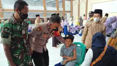 Gresik, Jawa Timur - Kejadian lucu terjadi saat vaksinasi Covid-19 usia 6-11 di Kabupaten Gresik. Seorang siswa Madrasah Ibtidaiyah (MI) Mambaus Sholihin, Desa Suci, Kecamatan Manyar bernama Ahmad Miftakhul Ulum, nekat meminjam topi salah satu polisi dengan alasan agar tidak takut disuntik vaksin Covid-19, Kamis (20/1/2022).