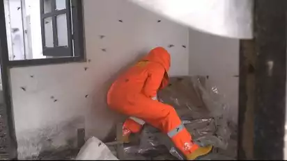 Petugas pun lantas menyemprot bensin ke dalam ruangan dan menutup lubang sarangnya dengan kain dan plastik yang sudah dilumuri bensin. Tujuannya, agar tawon mabuk dan tidak menyerang. Sehingga, mudah untuk dievakuasi.