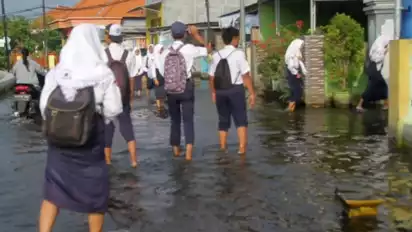 Ratusan murid dari 2 sekolah tersebut, sengaja berangkat dan pulang dari tempat belajar dengan berjalan kaki melewati banjir, tanpa mengenakan sepatu pelindung.