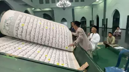 Jika biasanya jamaah tadarus duduk melingkar dengan mushaf berukuran standar, di sudut utama masjid justru terbentang Al-Qur’an berukuran raksasa.