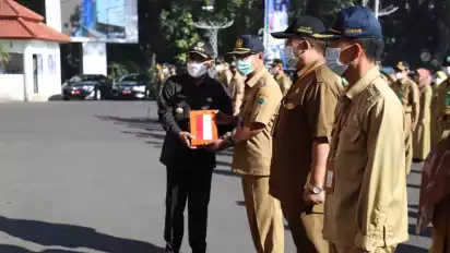Malang, Jawa Timur – Untuk menyemarakkan peringatan HUT ke-77 Kemerdekaan RI, Walikota Malang, Sutiaji, turut menyukseskan gerakan pembagian 10 juta Bendera Merah Putih. Bersama jajaran Forkopimda, Walikota Sutiaji menyerahkan bendera secara simbolis ke lima camat di Kota Malang dan perwakilan BUMD, saat apel pagi dengan jajaran OPD Kota Malang, Senin (1/8) di Halaman Balaikota Malang.
