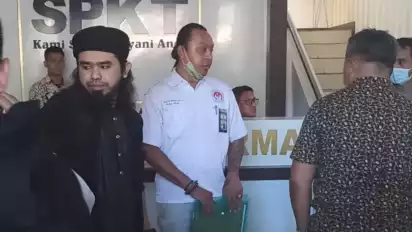 Surabaya, Jawa Timur - Gus Samsudin pemilik padepokan Nur Dzat Sejati yang berada di desa Rejowinangun, kecamatan Kademangan, Kabupaten Blitar Jawa Timur mendatangi gedung sentra pelayanan kepolisian terpadu (SPKT) Polda Jawa Timur, didampingi oleh istri dan tim kuasa hukumnya, Rabu siang (3/8/2022).