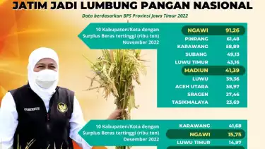 "Alhamdulillah, tingginya produktivitas beras maupun padi di kabupaten/ kota akan sangat berarti terhadap stok beras di Jatim dan nasional. Insyaallah, stok beras dalam kondisi aman hingga Desember 2022 bahkan surplus. Dan salah satunya wilayah yang produksi padinya sangat tinggi adalah Kabupaten Ngawi," kata Gubernur Khofifah di Gedung Negara Grahadi Surabaya, Selasa (6/12).