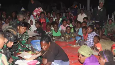 Anggota TNI memberi makan malam ke[pada ratusan warga dari beberapa kampung di Distrik Gome mendatangi Pos Gome Satgas Pamtas Mobile Yonif Raider 300/Bjw untuk meminta perlindungan.