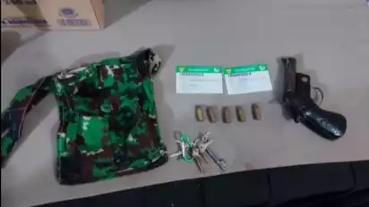 Tak lama setelah dilakukan pemeriksaan awal, pemuda yang dicurigai mengaku bernama HT (26) dan terlihat membawa senjata api rakitan jenis revolver satu pucuk dan munisi kaliber 9 mm sebanyak 4 butir.