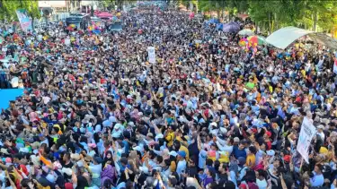 Pantauan tvOnenews.com di lokasi, setelah tiba di panggung utama, Gibran menyapa masyarakat yang hadir dengan menanyakan kabar peserta jalan sehat dalam bahasa Makassar.