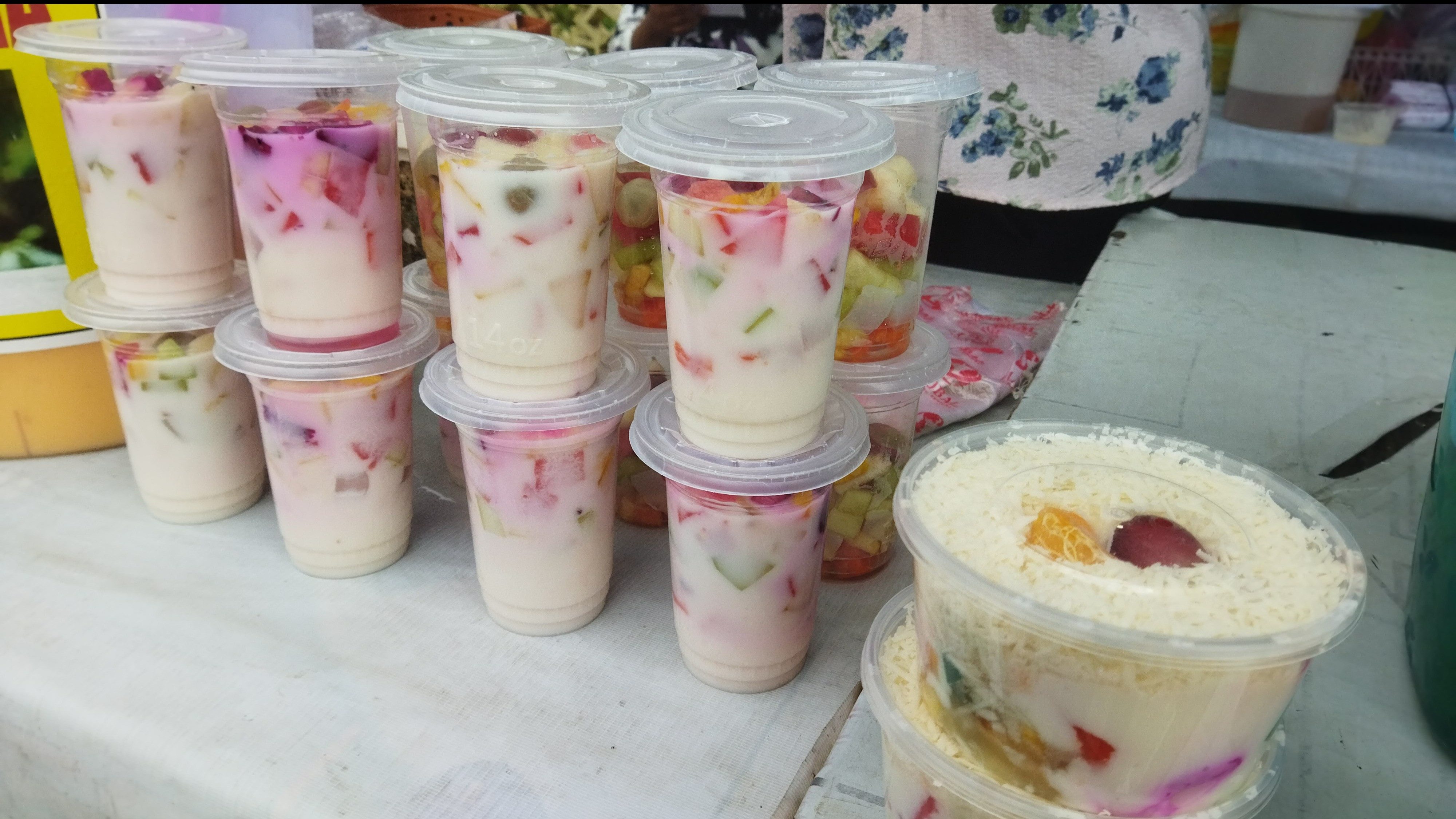 Hidangan buka puasa, es buah segar dengan susu kental di Pasar Ramdhan Mappanyuki.