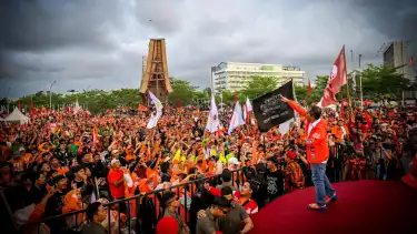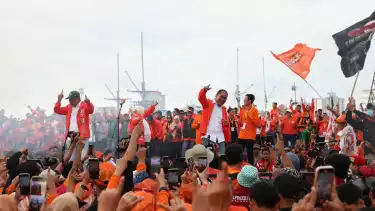 Makassar, tvOnenews.com - Dihadiri ribuan pendukung, Calon Gubernur (Cagub) dan Calon Wakil Gubernur (Cawagub) Sulawesi Selatan, Mohammad Ramdhan Pomanto dan Azhar Arsyad menggunaka perahu phinisi menuju lokasi kampanye akbar di Anjungan MNEK, Kawasan Centre Point Of Indonesia (CPI), kota Makassar, Jumat (22/11/2024).