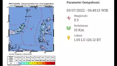 Jakarta - Gempa bumi berkekuatan magnitudo 5,3 guncang wilayah Tenggara Bitung, Sulawesi Utara, Minggu (3/7/2022)