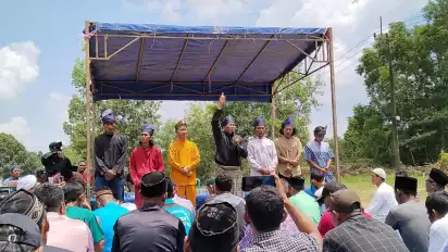 Batam, tvOnenews.com - Ratusan masyarakat tempatan perkampungan berkumpul di halaman pergudangan kelompok tani Ya Abunnayya, Cate Galang, Minggu (17/9/2023) pagi, guna menggelar tolak bala dan sekaligus pemberian gelar panglima terhadap 8 pemuda Rempang yang ditangguhkan. Mereka juga disirami beras kuning dan dipasangi tanjak kebanggaan.