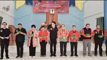 tvOnenews.com - Dewan Pimpinan Pusat (DPP) PDI Perjuangan menggelar perayaan natal nasional bersama masyarakat terdampak bencana di Kabupaten Tapanuli Tengah (Tapteng), Sumatra Utara.