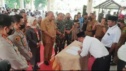 Langkat, Sumatera Utara - Jelang pelaksanaaan pemilihan Kepala Desa (Pilkades) serentak di Kabupaten Langkat pada 19 Juni 2022 mendatang, 578 calon Kepala Desa mengikuti deklarasi Pilkades Damai yang dilaksanakan di Pendopo Jentera Malay yang dihadiri langsung Plt Bupati Langkat, Syah Afandin beserta sejumlah unsur Forkopimda Kabupaten Langkat, Senin (13/6/2022).