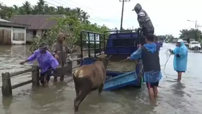 "Sudah dua hari ini kandang terendam banjir dan kami takut genangan air semakin tinggi. Jadi terpaksa ternak-ternak dipindahkan ke dataran yang lebih tinggi," ungkap Junaidi, Jumat (1/07/2022) siang.