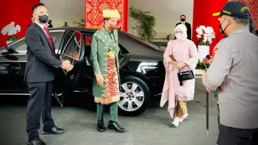 Sedangkan untuk ornamen di kepala, Presiden Jokowi juga mengenakan Sungkon (tutup kepala) berwarna emas yang melambangkan keagungan dan keluhuran.