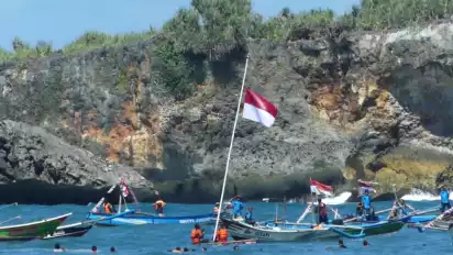 Gunungkidul, DIY - Setelah 2 tahun vakum karena pandemi Covid-19, upacara peringatan detik-detik proklamasi di laut kembali digelar SAR Satlinmas Wilayah 2 Yogyakarta di Pantai Baron, Gunungkidul.