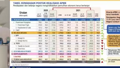 Sri Mulyani menuturkan pendapatan tersebut tumbuh 13,9 persen (yoy) dibandingkan periode sama 2020 yaitu sebesar Rp1.034,3 triliun yang turun 13,1 persen dari Agustus 2019.