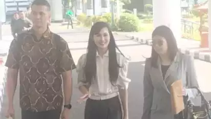 Terlihat Sandra Dewi didampingi dua orang pria tiba di gedung Kejagung, Jakarta, pukul pukul 09.25 WIB. Dia datang mengenakan kemeja berwarna putih dan celana panjang hitam.
