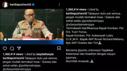 “Sukses dan sehat selalu @poldametrojaya @siberpoldametrojaya. Terima kasih klarifikasinya Bapak Kombes. Pol. Drs. Yusri Yunus, Bapak Kombes. Pol. Auliansyah Lubis, S.IK.,M.H, Bapak AKP Rovan Richard Mahenu, Bpk AKP Charles dan tim,” lanjut Kartika Putri.