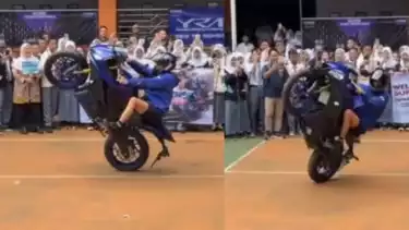 Toprak bahkan melakukan sejumlah atraksi menggunakan Yamaha R25, mulai dari wheelie hingga burnout di lapangan sekolah.