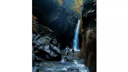 Setelah melewati perjalanan yang melelahkan, para wisatawan akan menemukan sebuah fenomena alam yakni  air terjun cantik yang tersembunyi di balik dinding batu. Berada persis di sisi kiri dan kanan dipenuhi lumut dan tumbuhan, warna hijau mempercantik air terjun.